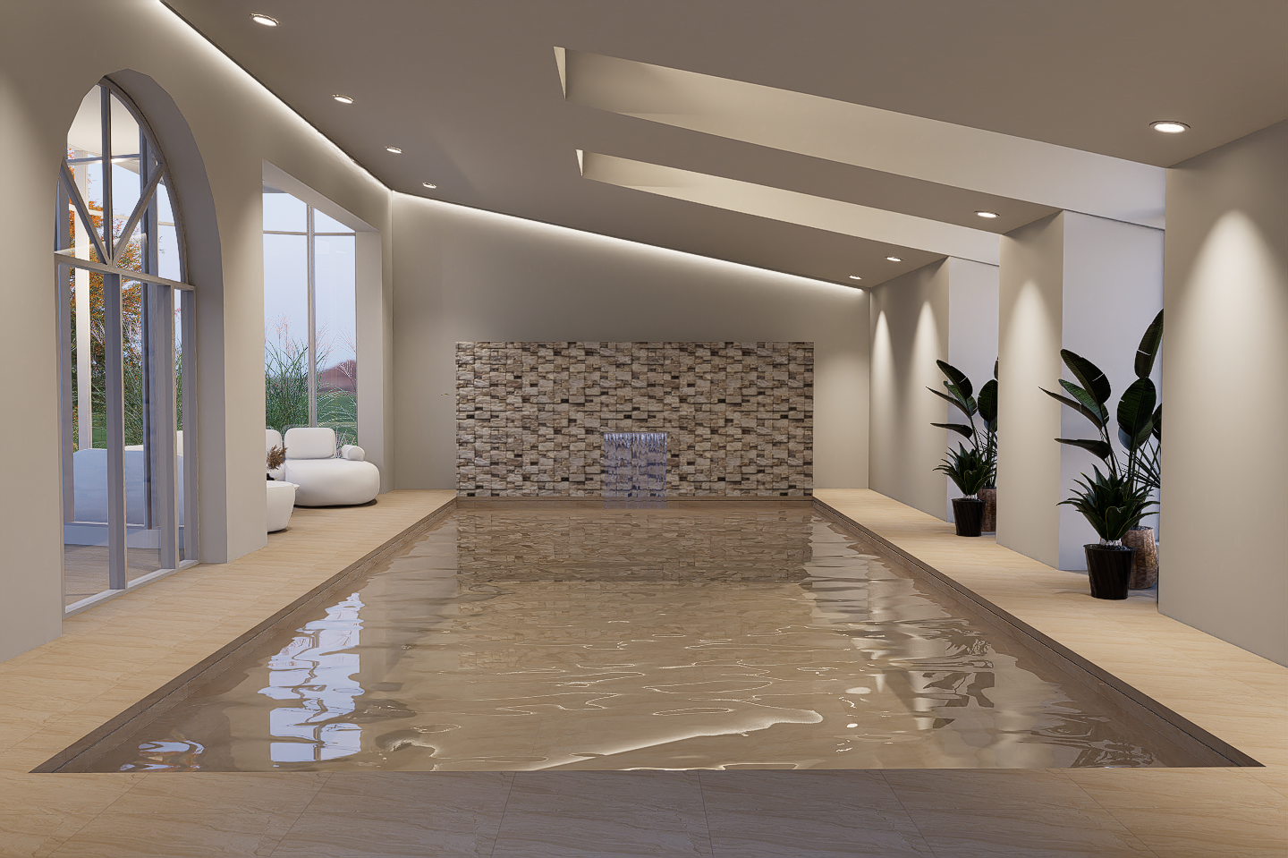 The pool reflects soft light from the sculpted ceiling above, while recessed lighting and natural stone add warmth and texture. Hidden behind the central stone feature wall is a discreet walk-in shower—preserving the room’s clean aesthetic while enhancing functionality.